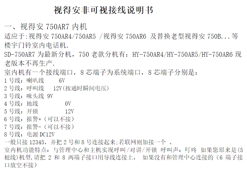 3、家里使用对讲门铃型号为视得安750AR7,查询说明书,8号线有12V DC供电,万用笔测试供电电压正常。则可选用12V WIFI继电器,直接使用对讲门铃供电,无需外接电源。