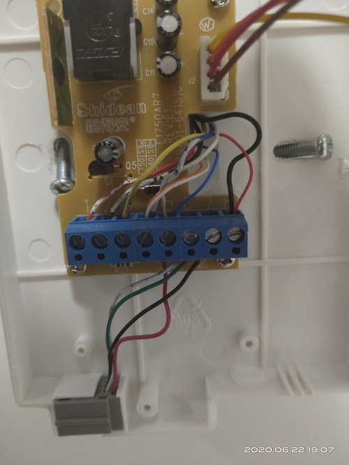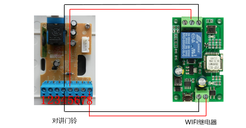 到家开始动手改造,因为知道对讲门铃各信号线端口定义,所以接线很方便,对接门铃12V供电正极(8号线)、负极地线(4号线),接WIFI继电器供电正负极;对接门铃开锁(5号线)、地线(4号线)接继电器常开端口、公共端口。