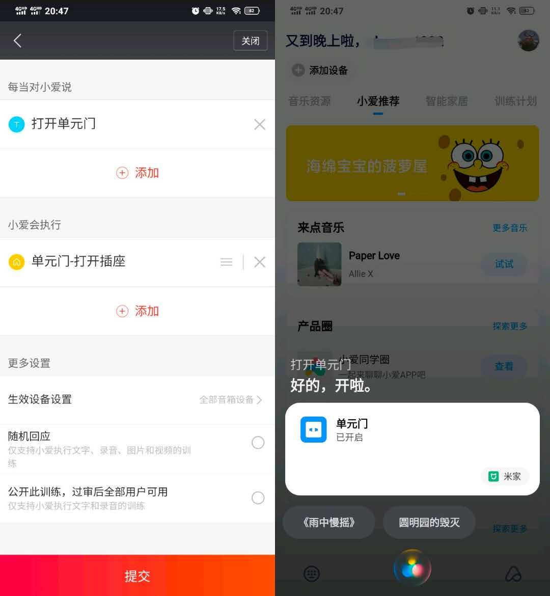在小爱音箱中,新建一条训练,对小爱说“打开单元门”(语音指令可以自由发挥,比如:芝麻开门),执行易微联继电器打开。训练设置好后,用小爱同学测试执行结果正常。