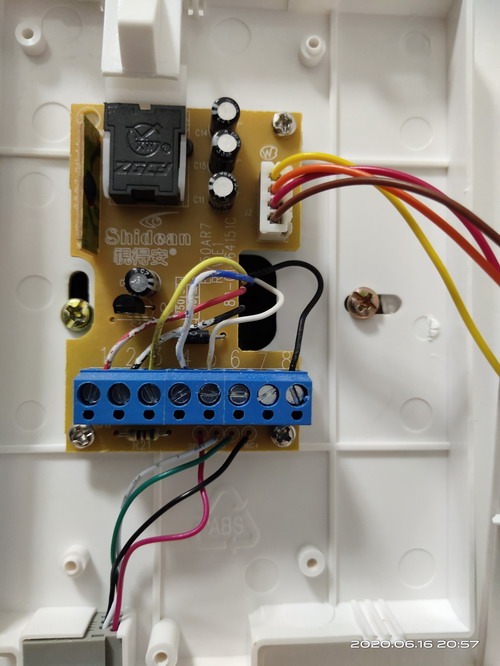 到家开始动手改造,因为知道对讲门铃各信号线端口定义,所以接线很方便,对接门铃12V供电正极(8号线)、负极地线(4号线),接WIFI继电器供电正负极;对接门铃开锁(5号线)、地线(4号线)接继电器常开端口、公共端口。
