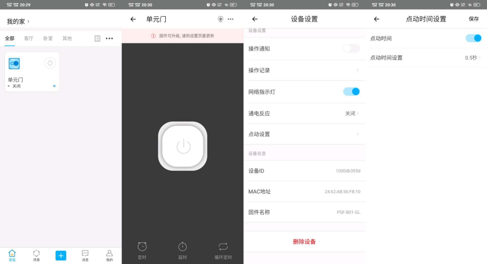 设备添加完毕后,需要设置一下,将点动设置启用(开继电器吸合后迅速断开),点动时间默认是0.5秒。易微联APP测试,单元门锁开锁正常。