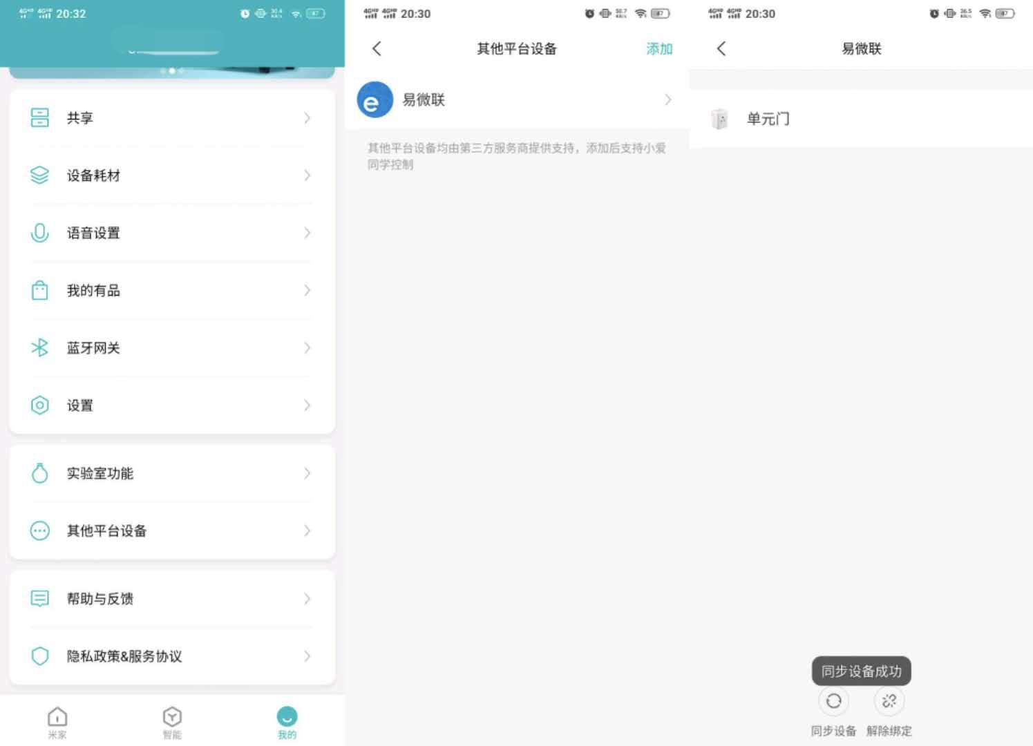 为了实现小爱语音控制,需要在米家APP--其它平台设备中绑定易微联帐号,下方同步设备,刷新后可以看到易微联帐号下的设备。